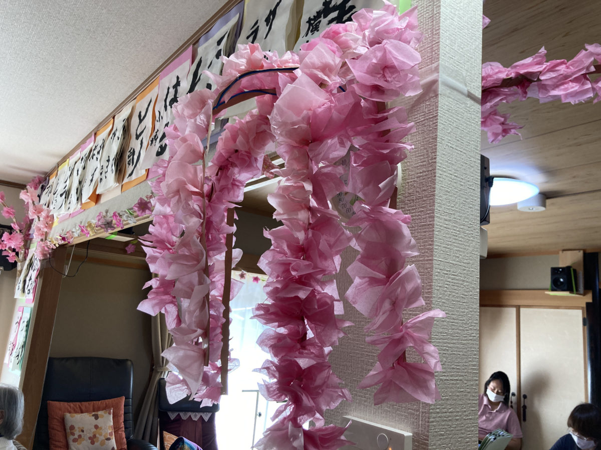 コロナ禍の影響で、外出できない状況が続いていますが、デイサービスセンター笑顔では少しでもお花見気分を味わえるよう、ご利用者様とスタッフみんなでしだれ桜を作成しました。幹と枝が別々で制作されて、枝がゆらゆらとしなやかに動くクオリティーの高い作品に仕上がりました。