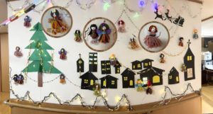 毛糸にフェルトの羽をはり、天使を作りました。イルミネーションで光り輝く街に降りたち、一緒にクリスマスをお祝いしているようでした。