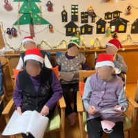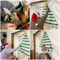スタッフによるリコーダー・ハンドベル・鍵盤ハーモニカの演奏に加え、クリスマスにちなんだ〇✕クイズと「全員で完成させるぞ」クリスマスツリーゲームを行いました。とてもステキなツリーが完成しました。